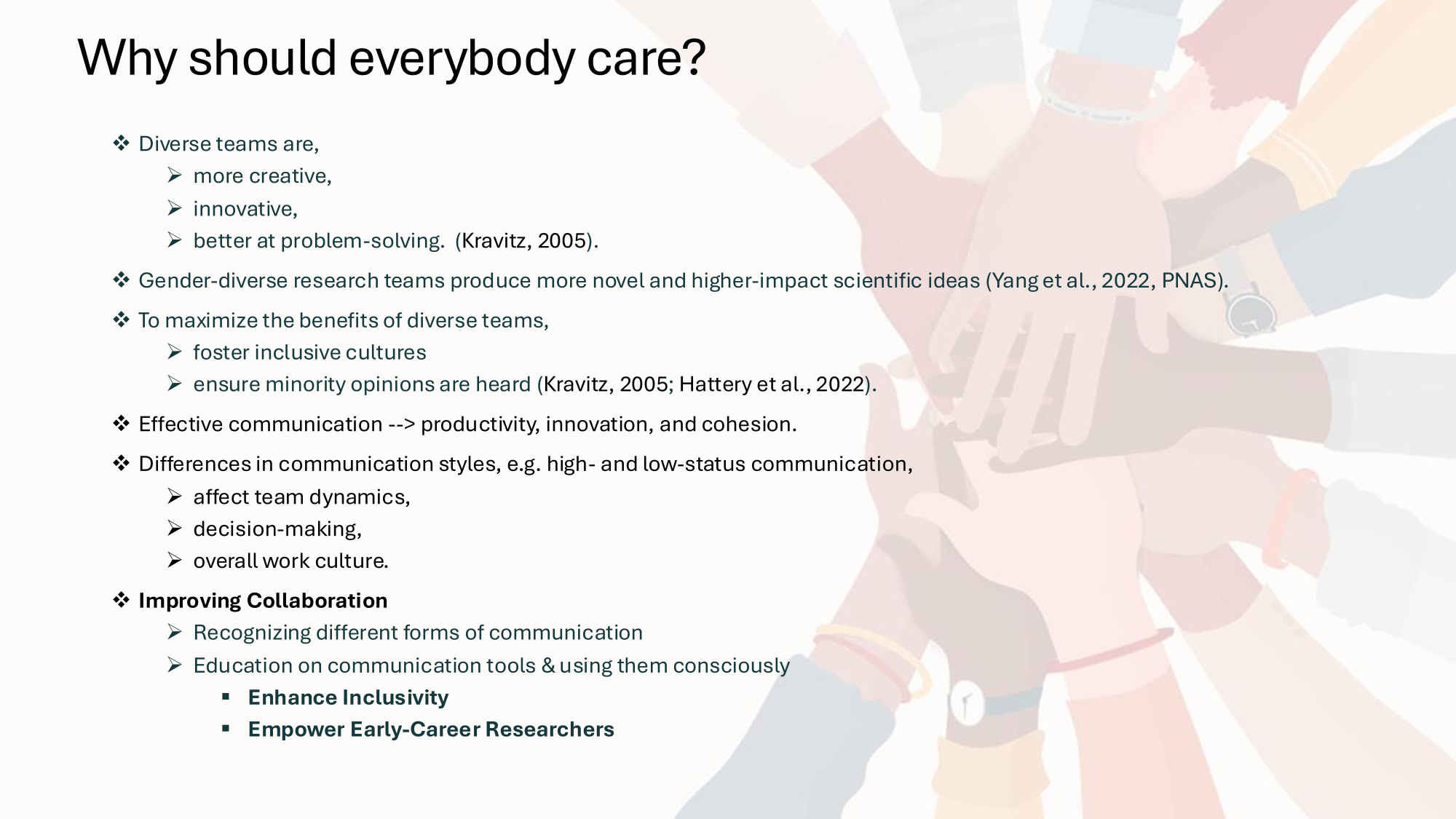After an excursion on the fact that status behavior is present in animals and not unique to humans, the impact of status communication on team dynamics in collaborative research was discussed. The message was again discussed that flexibility in status behavior is beneficial for team dynamics to signal a balance between respect/assertiveness and openness/approachability.