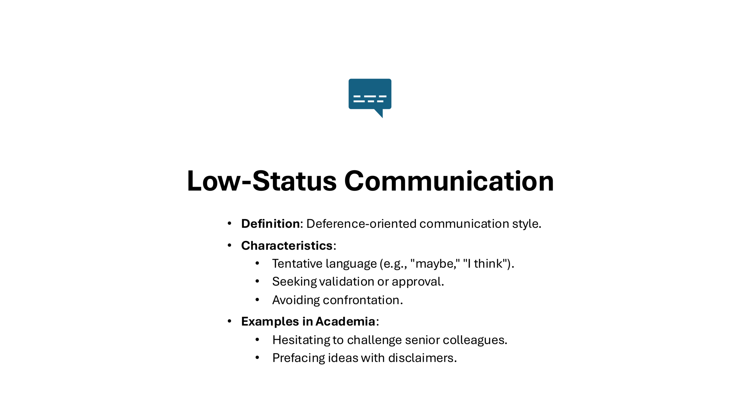Status in communication can be signalled not only through different choices of words or content but also through gestures, facial expressions, eye contact or the lack thereof, differences in pronunciation, intonation, speed accelerations or pauses, body language, status symbols and/or the usage of space. Simple changes in any of these tools can enable a status change and create status flexibility, while these changes can simultaneously create a mental interaction with ourselves (e.g. ‘power poses’).