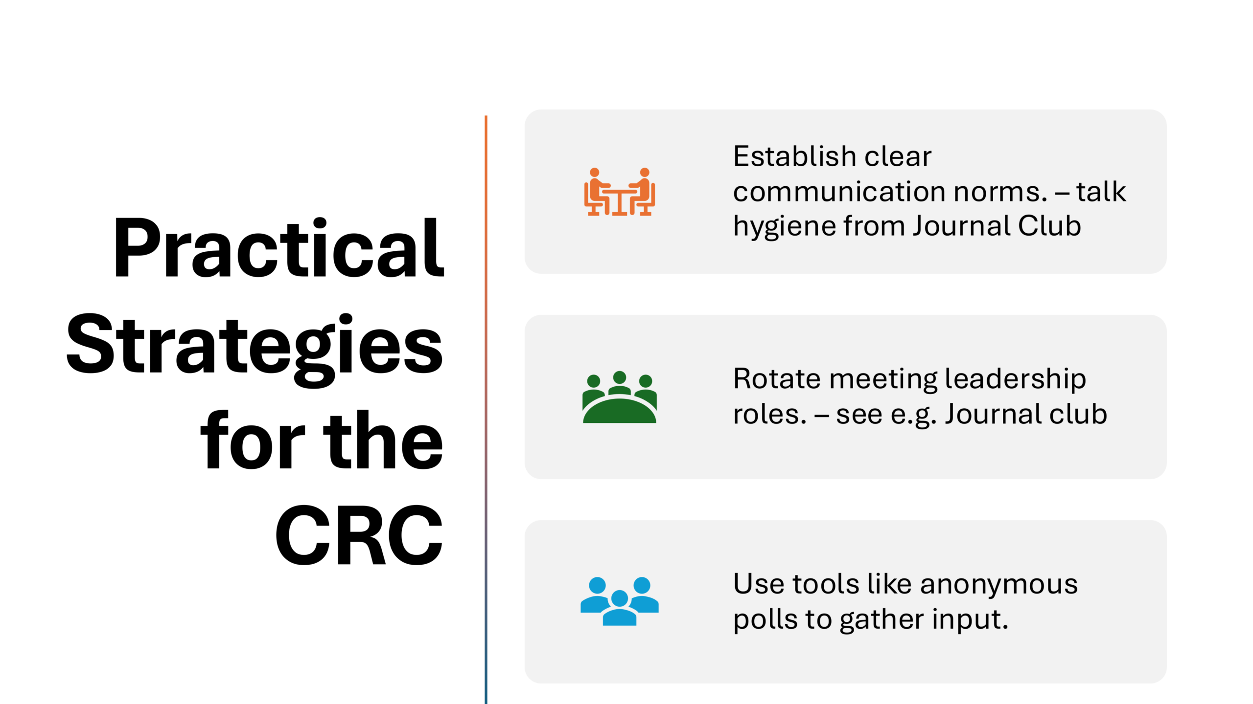 Following the introduction of tools associated with high-/low-status communication, the audience was grouped in pairs into break-out rooms and instructed with example dialogues for an improvisation-style role-play. The dialogues were from common dialogues within the CRC ReTune, and the task of each participant was to repeat the same dialogue as a low-status communicator and a high-status communicator with their partners in the opposing role. This allowed practicing and balancing both communication styles consciously, as well as to recognize how they may impact our collaboration and research if not used consciously.